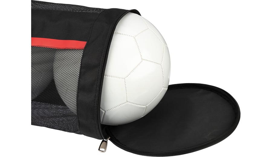 | Kenmerken | • polyester mesh met polyester 600 x 600 D top/bodem/zijpanelen • ritssluiting • bovenkant en bodem rondom met bies • verstelbare PP draagband • handvat • geschikt voor 5 ballen (maat 5) • afmeting ca. 108 x ø 24 cm |