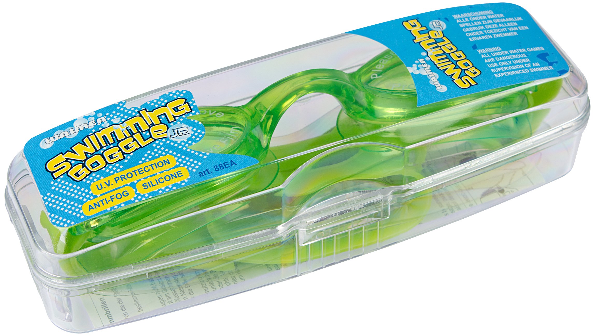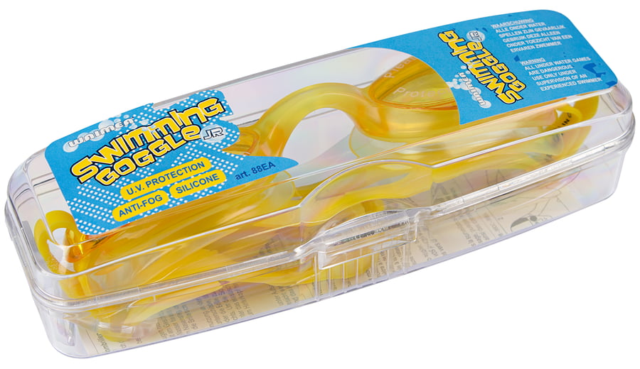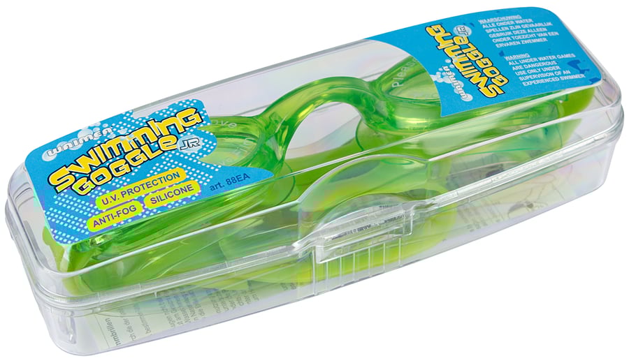 | Kenmerken | • polycarbonaat lens met PVC frame • verstelbare silicone hoofdband • licht getinte lenzen voorzien van UV protectie • frame en neusbrug uit een stuk • transparant opbergdoosje |