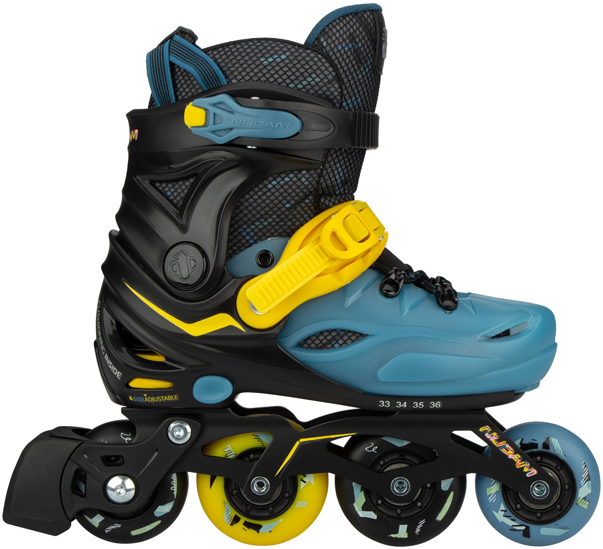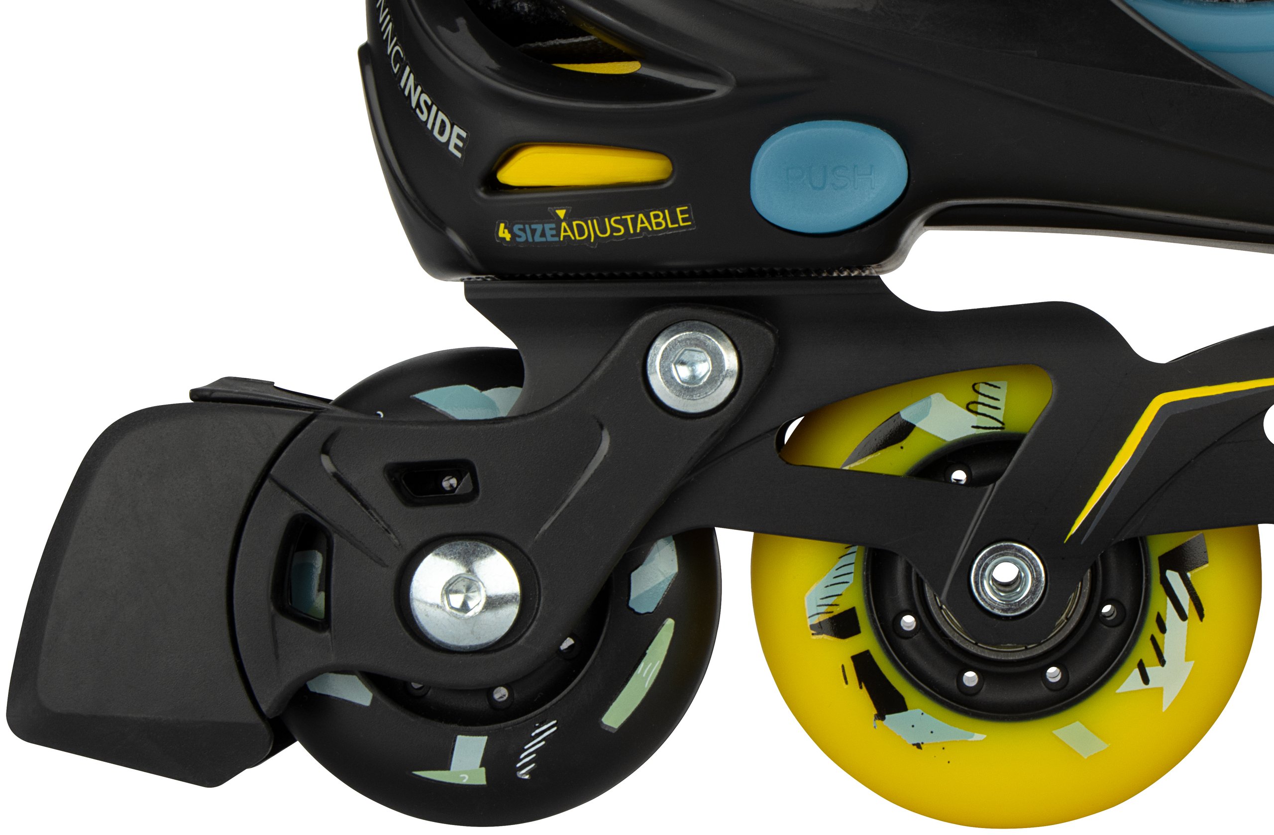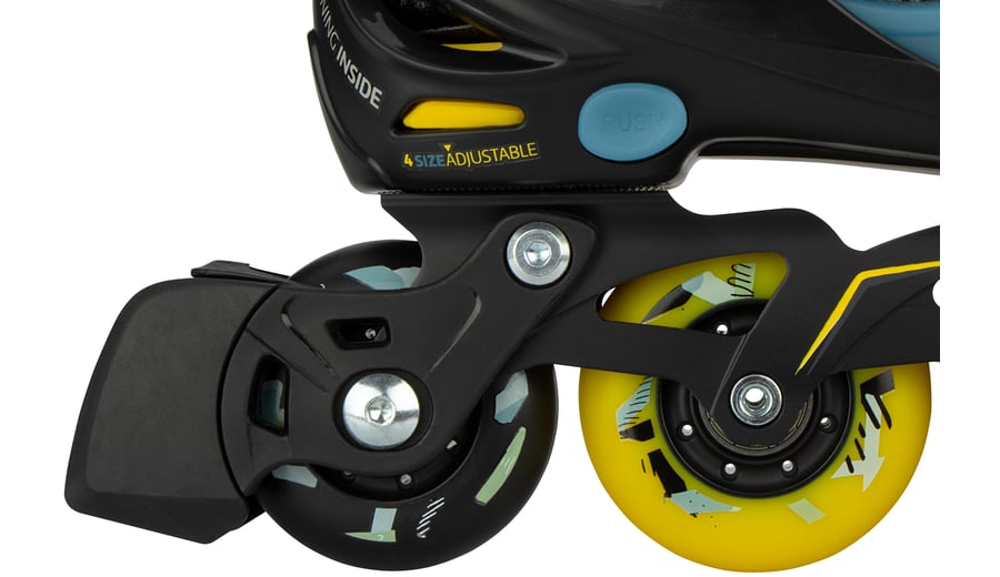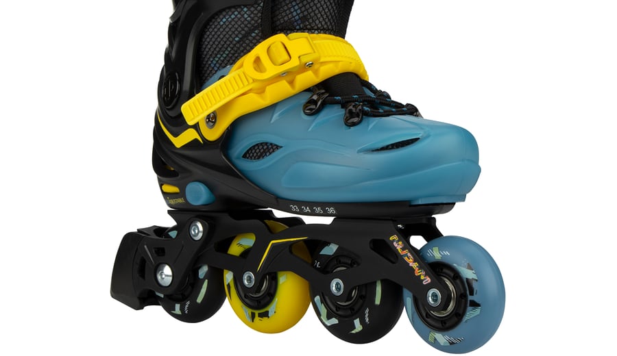 | Kenmerken | • Verstelbaar in 4 maten middels drukknopmechanisme • Quick-lock snelsluiting met PU lederen powerstrap en veters • Buitenschalen: schokabsorberend PE • Binnenschoen: comfortabel polyester, EVA en parelschuim • Chassis: aluminium • Wielen: PU gegoten 85A, matte afwerking, maat 33-36: 64 x 24 mm en maat 37-40: 72 x 24 mm • Lagers: gesloten ABEC 7 chrome • Rem: TPR 85A • Inclusief 2 inbussleutels |
