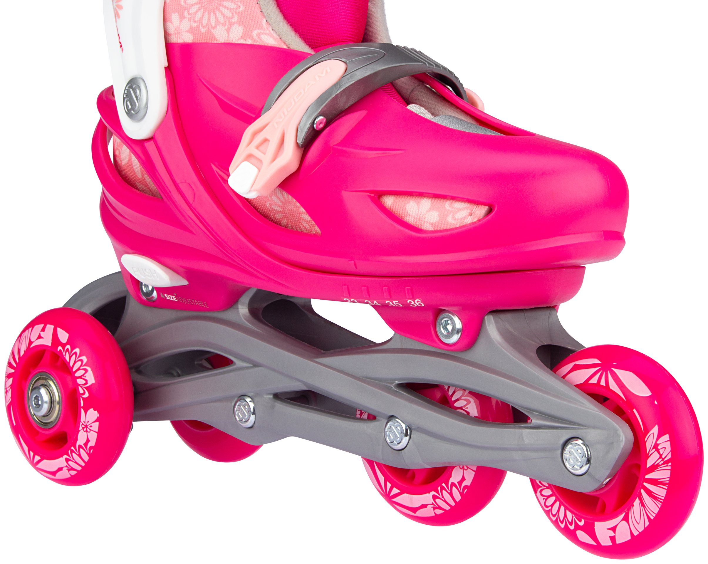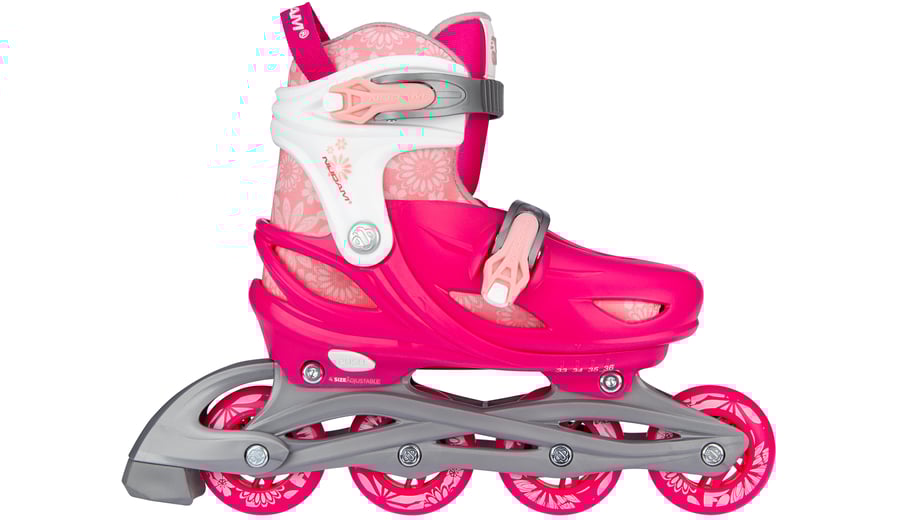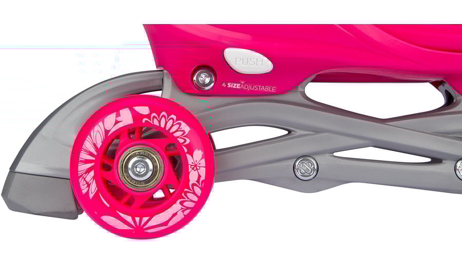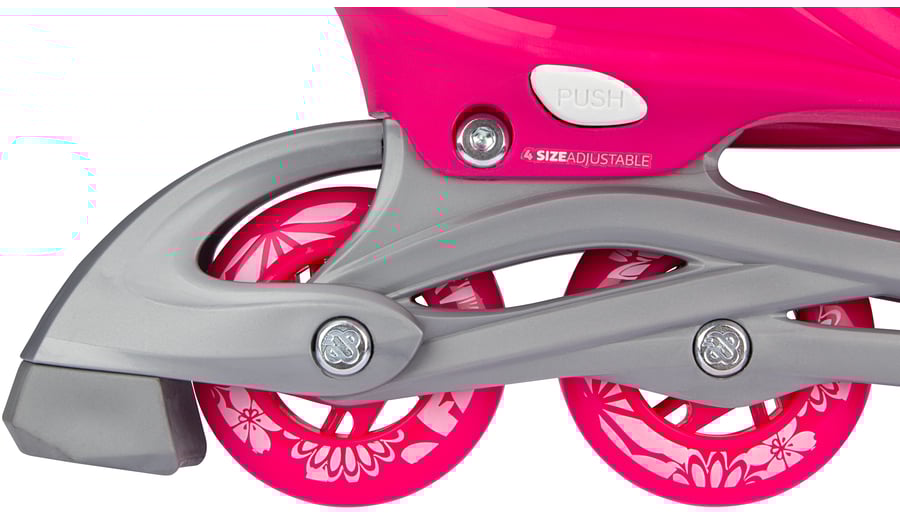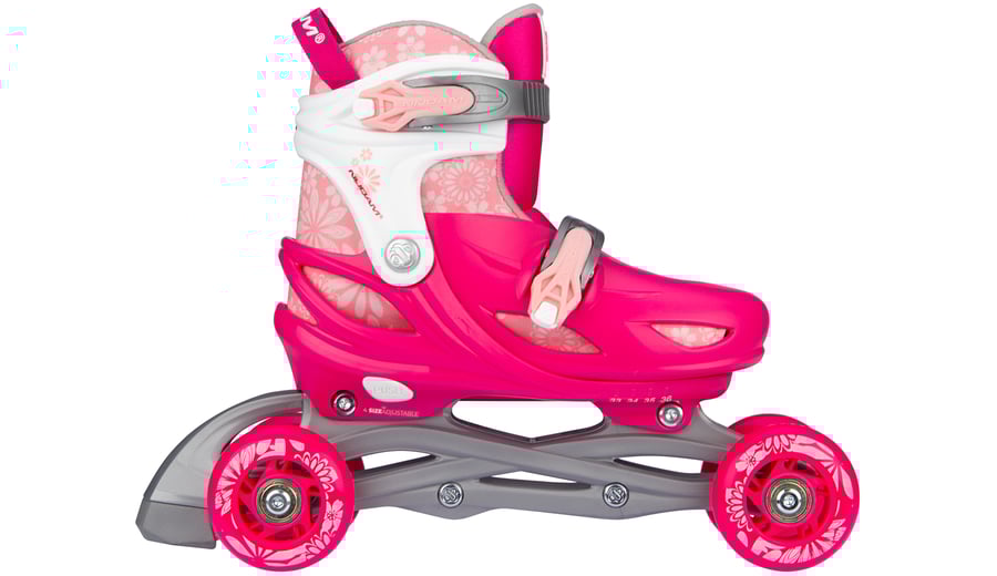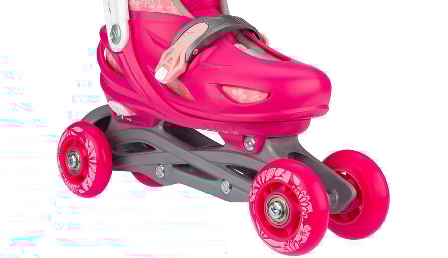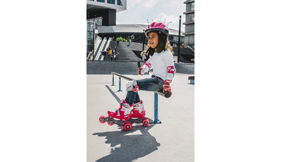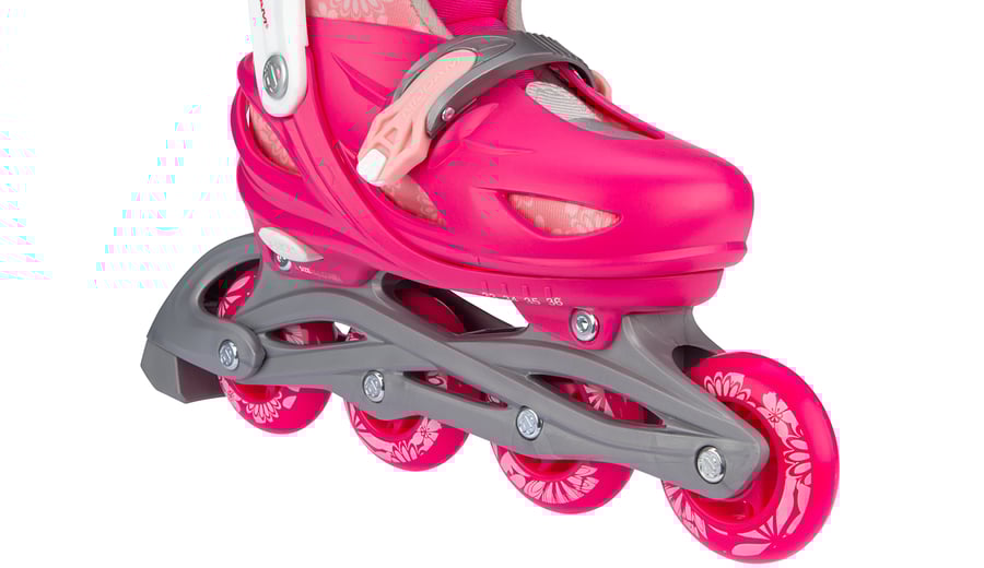 | Kenmerken | • Meerdere gebruiksmogelijkheden: inlines, quads of trikes • Verstelbaar in 4 maten middels drukknopmechanisme • Quick-lock snelsluiting • Buitenschalen: schokabsorberende PE • Binnenschoen: comfortabel polyester, EVA en parelschuim • Chassis: high-impact PP • Wielen: PU gegoten 82A, maat 25-28: 64 x 24 mm, maten 29-32 en 33-36: 70 x 24 mm • Lagers: gesloten ABEC 5 carbon • Rem: TPR 85A • Inclusief 2 inbussleutels |
