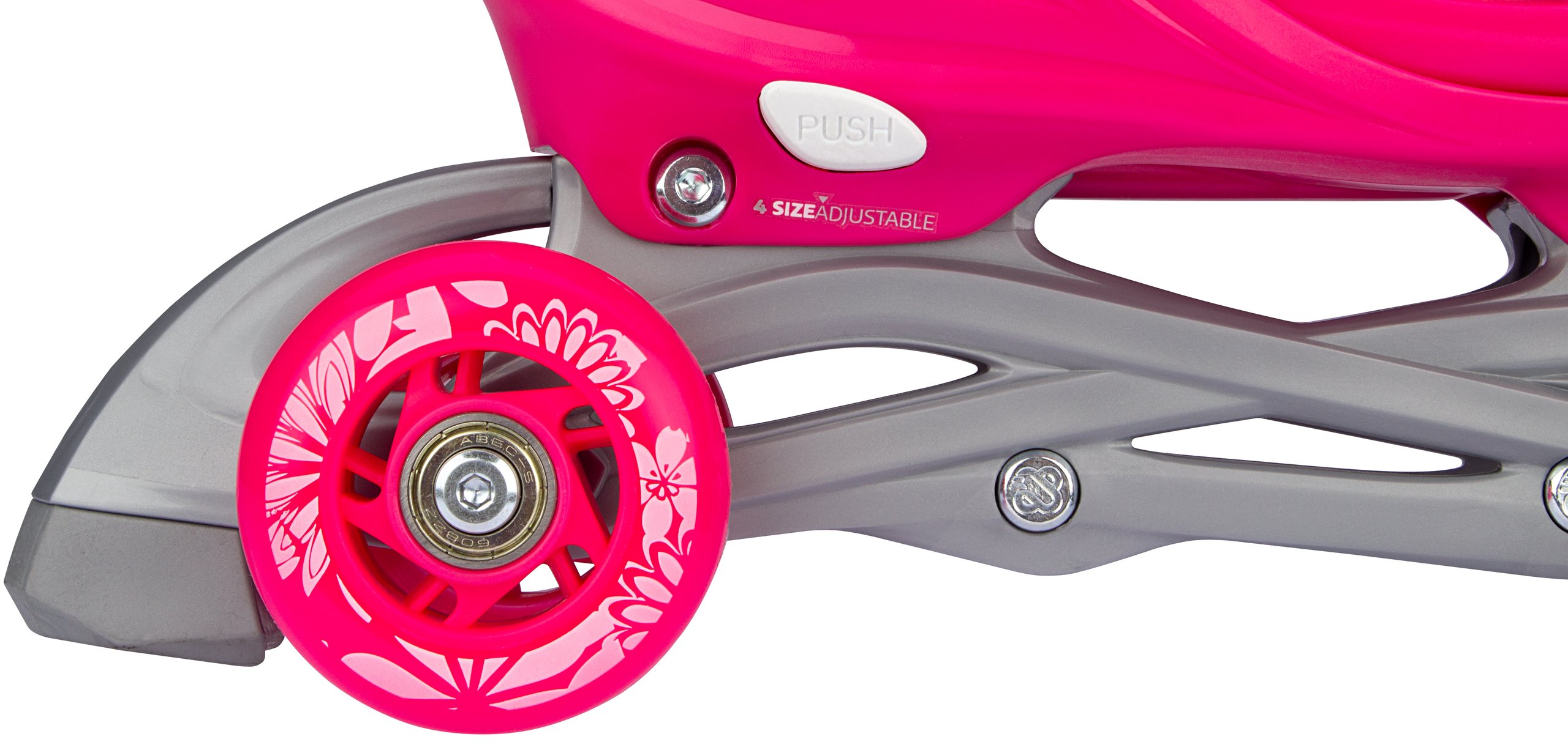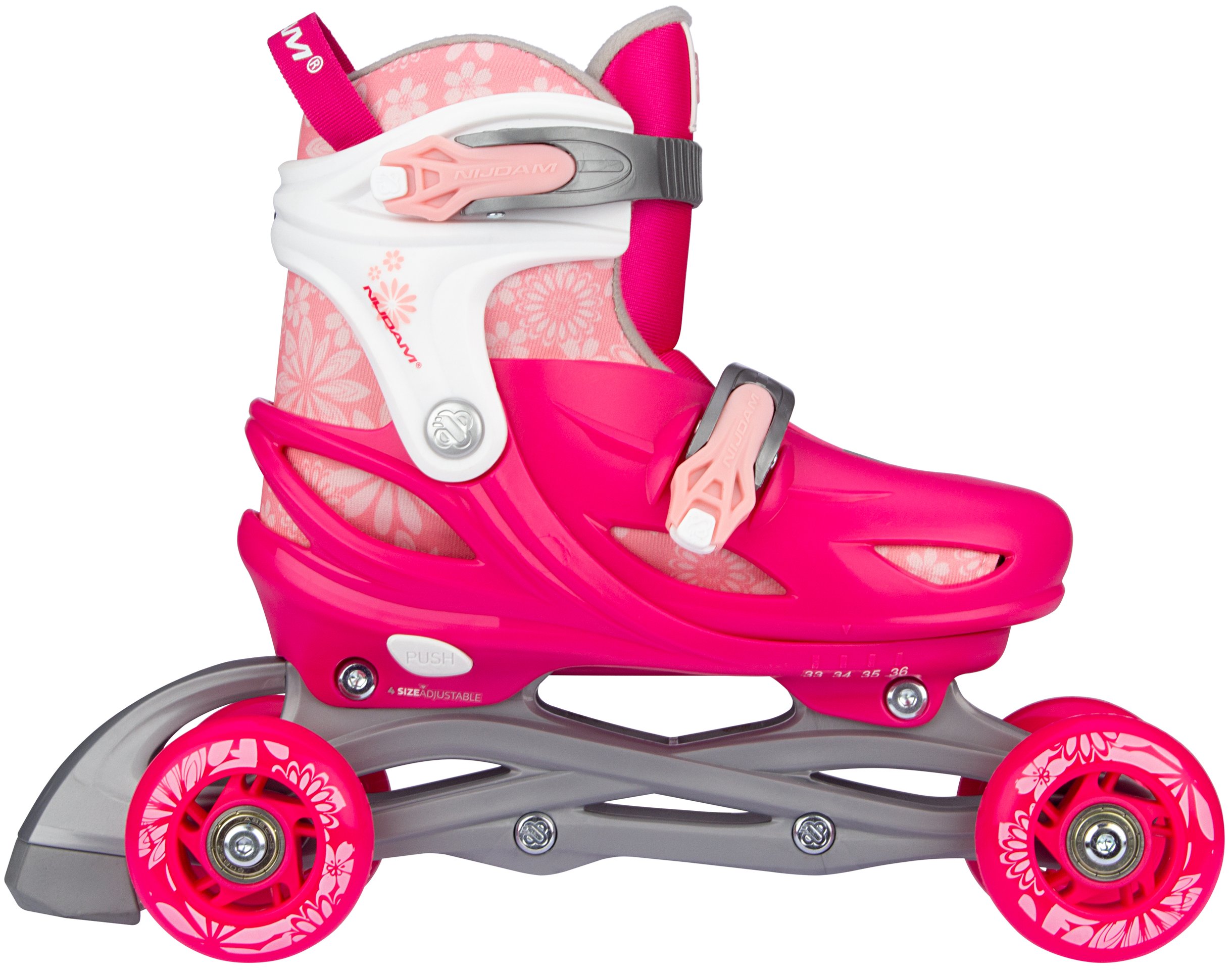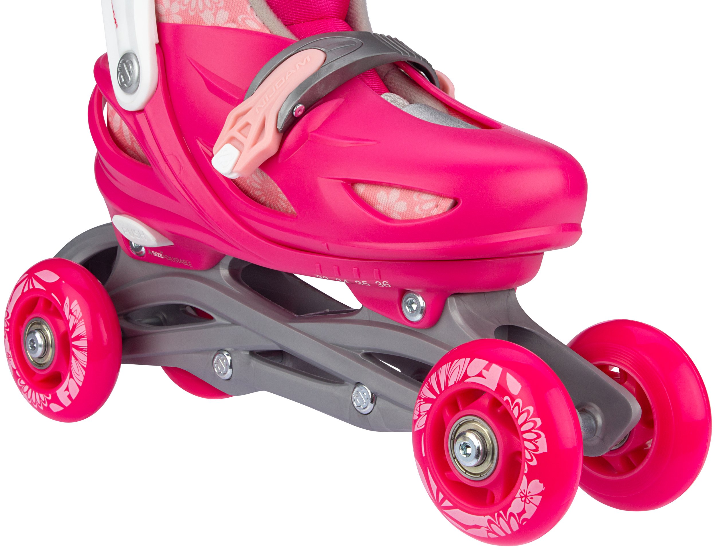 | Kenmerken | • Meerdere gebruiksmogelijkheden: inlines, quads of trikes • Verstelbaar in 4 maten middels drukknopmechanisme • Quick-lock snelsluiting • Buitenschalen: schokabsorberende PE • Binnenschoen: comfortabel polyester, EVA en parelschuim • Chassis: high-impact PP • Wielen: PU gegoten 82A, maat 25-28: 64 x 24 mm, maten 29-32 en 33-36: 70 x 24 mm • Lagers: gesloten ABEC 5 carbon • Rem: TPR 85A • Inclusief 2 inbussleutels |