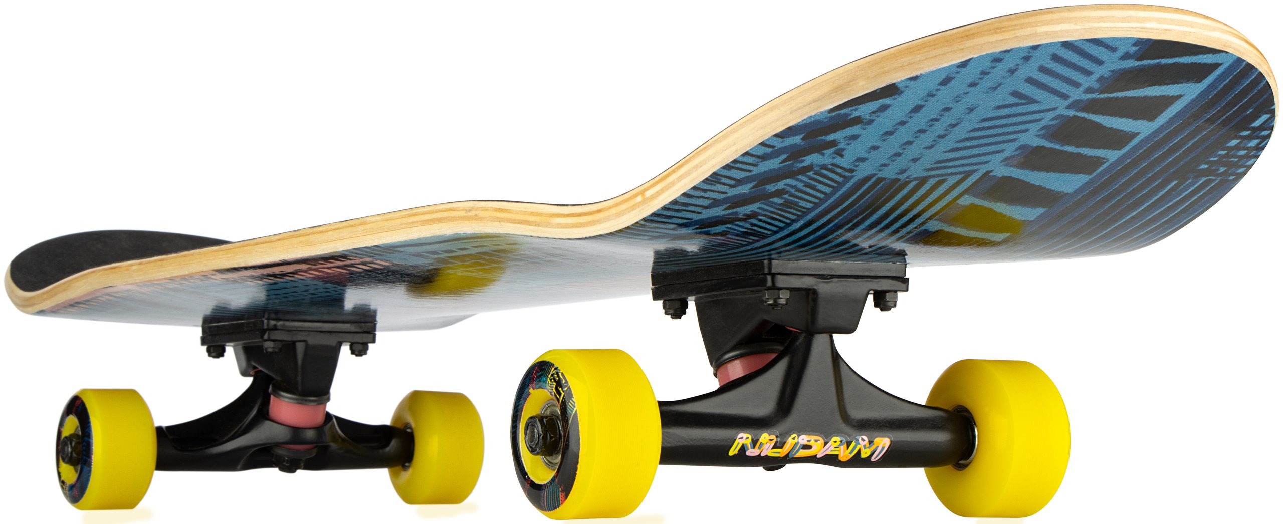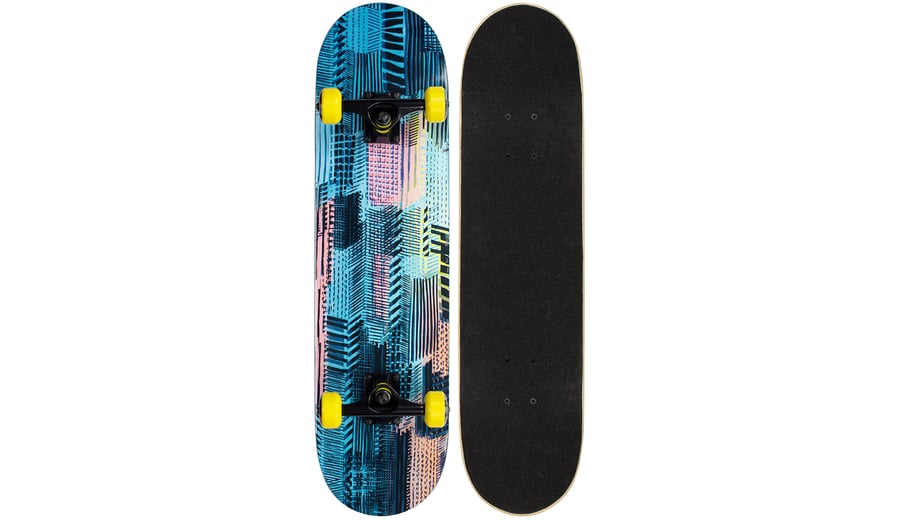 | Kenmerken | • Board: double kicktail, concave, 7-laags esdoorn met print aan onderzijde, zwart griptape, 79 x 20 cm • Trucks: Big 5V aluminium, matzwarte poedercoating, PU 90A demping • Wielen: PU injectie 90A, 52 x 32 mm • Lagers: gesloten ABEC 7 chroom • Maximale belasting 100 kg |